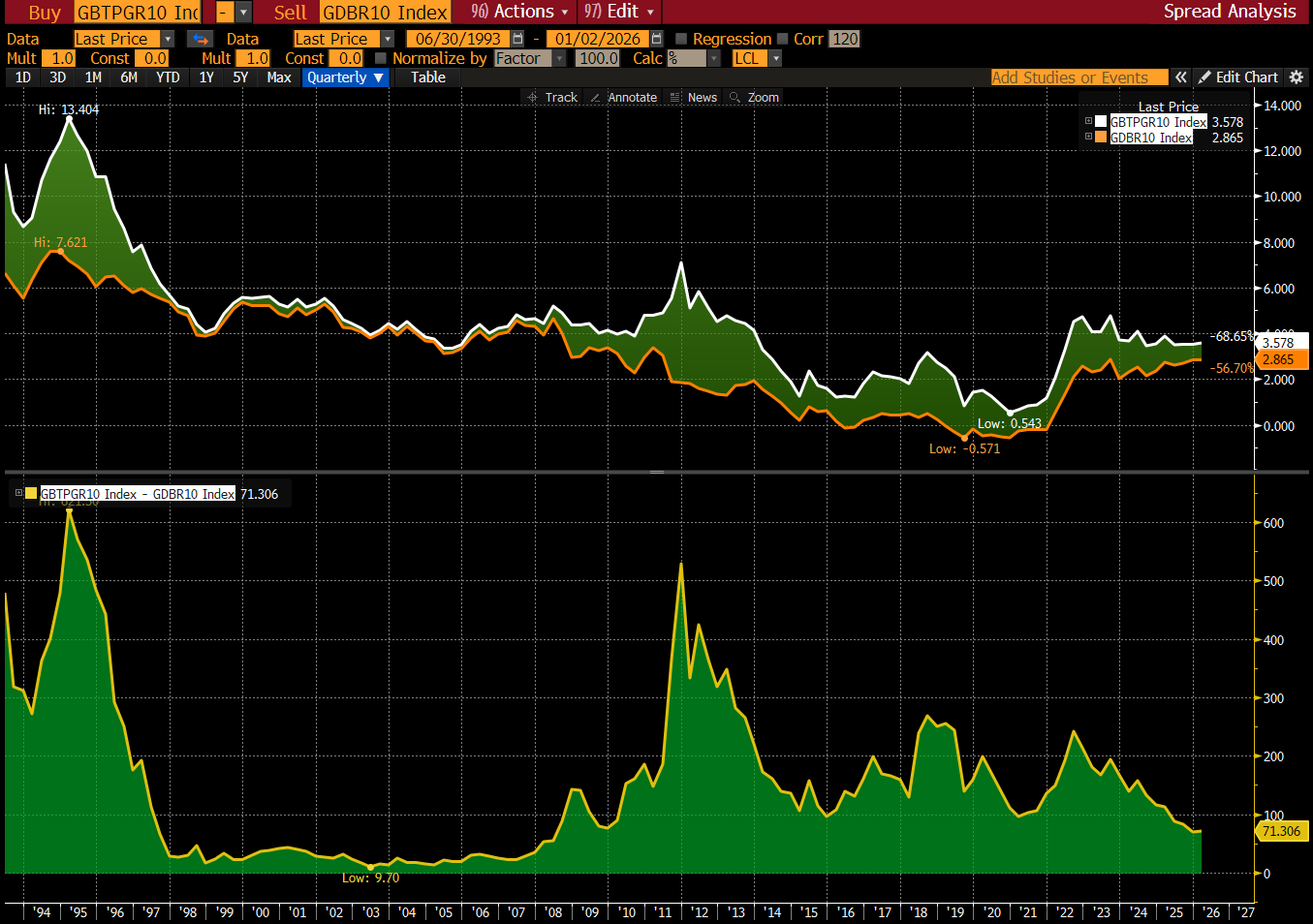 During the holiday break, one move that has snuck under the radar has been the continued decline in the BTP/Bund spread to a 16-year low.